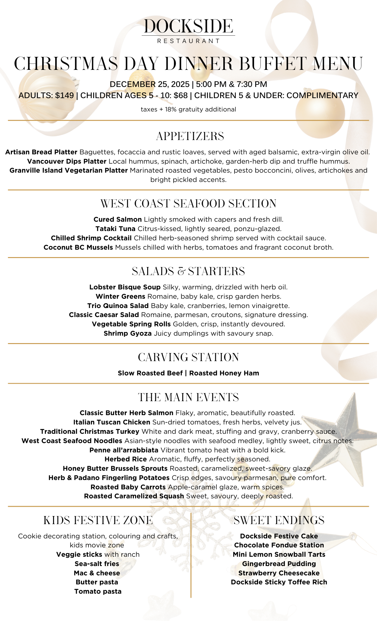 Make your Christmas dinner in Vancouver unforgettable with a festive buffet at Dockside Restaurant, set against the stunning waterfront views of False Creek. Delight in a spread of holiday classics elevated with a creative twist by our Chef, and indulge in a dessert station featuring a chocolate fountain—perfect for a sweet holiday treat.